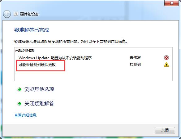 4、检测硬件设备。打开控制面板,选择“疑难解答-硬件和声音-硬件和设备”,然后点击“下一步”,进行检测和修复。