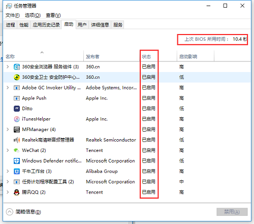 步骤4:下图可以看到我们开机所用的时间,以及开机启动的应用程序,根据自己的需求关闭不需要启动的程序,右键点击选择禁用即可。下图所示: