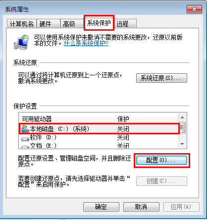 5.在系统属性菜单中,选中上方的“系统保护”标签- 选择系统盘(一般是C盘)- 点击“配置”按钮: