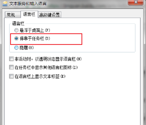 5.然后切换到语言栏选项,我们可以看到语言栏是隐藏的,所有输入法消失不见了,点击停靠于任务栏,然后再点击应用并确定就可以了。