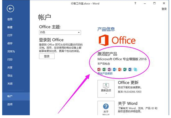 6、打开Word2016,点击左上角文件,找到账户,看看office有没有激活吧