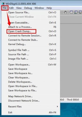 3、打开WinDbg后我们点击左上角的【File】,点击【Open Crash Dump】选择.DMP文件打开。