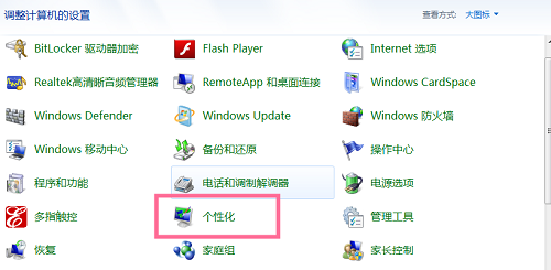 2、打开控制面板后,将右上角的查看方式改为大图标,找到并点击个性化