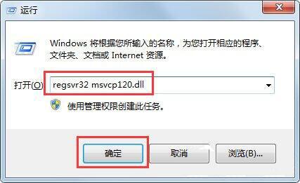 4、接着按Win+R键打开运行,或者是打开开始菜单,从附件里面点击运行,在输入框位置输入regsvr32 msvcp120.dll,点击确定;如图所示:
