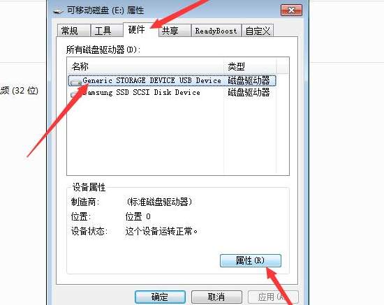 2)弹出窗口,切换到硬件选项栏,选择带usb字样的磁盘,单击属性;