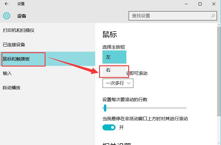 3、打开设备设置界面后,点击左侧列表中的“鼠标和触摸板”选项,然后在右侧窗口中,将鼠标下的“选择主按钮”设置为“右”即可。如下图所示