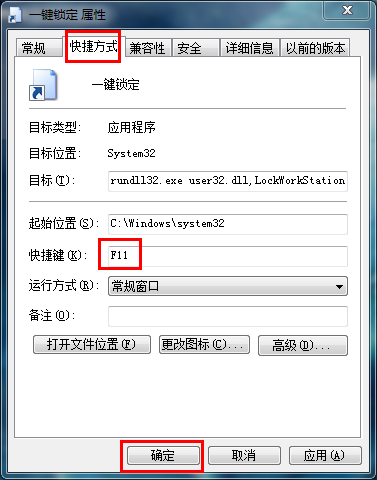 5.在弹出的窗口中,切换到“快捷方式”选项卡,在快捷键位置输入“F11”,点击“确定”按钮保存退出。
