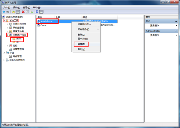 2.打开计算机管理窗口后,从左边栏目中依次进入“系统工具” — “本地用户和组” — “用户”,在右边栏目中,右击需要修改密码的账户,选择“属性”,如下图所示