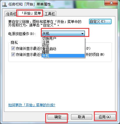 2.在打开的新窗口,切换到“[开始]菜单”,电源按钮操作下拉菜单,更改为关机然后点击“应用”,再点击“确定”。