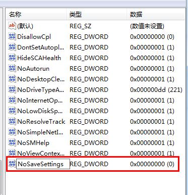 3、把新建的DWORD值重命名为“NoSaveSettings”,如图: