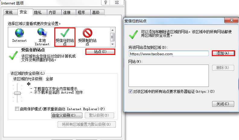 2、选择安全页中的“受信任的站点”,单击站点按钮,在框中输入“www.taobao.com”,点击添加,如图: