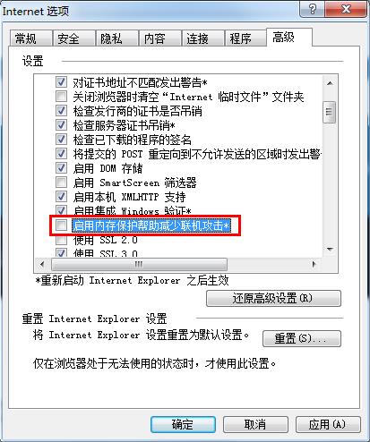 3、切换到高级页,取消勾选“启用内存保护帮助减少联机攻击*”,确定保存后重启浏览器即可。