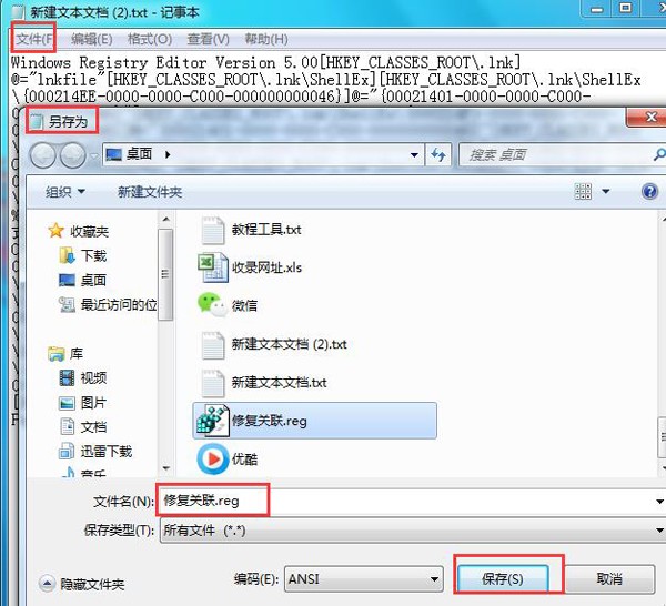 4、如果一打开某个文件报错,则可能是文件关联错乱所致,重新定义即可。复制以下代码到记事本中,选择“文件-另存为”,然后保存为“修复关联.reg”,点击“保存”。