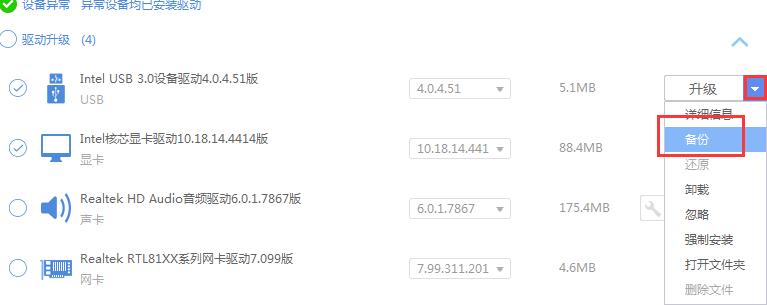 3、找到所有已安装的驱动,选择需要备份的驱动程序,点击后面的倒三角,选择“备份”。