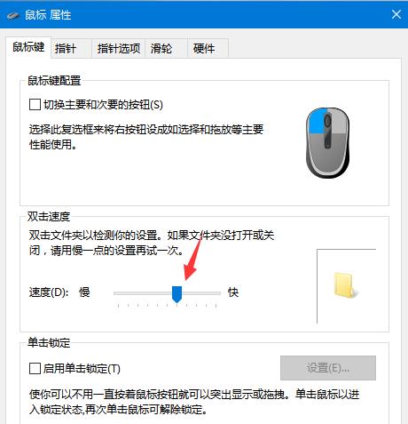 2、在双击速度中将速度设置得慢点,双击允许的间隔就越长,也就越容易双击成功打开软件,如图所示: