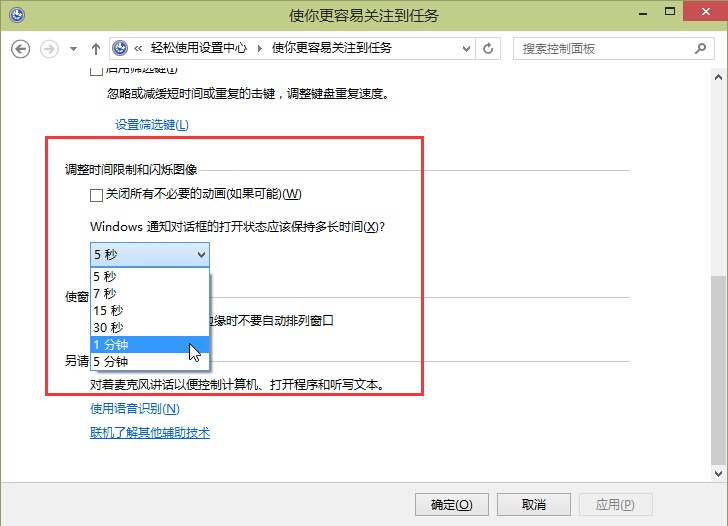 4.拖动滚动条到界面底端,在调整时间限制和闪烁图像下调整通知对话框保存的时间即可。如下图所示