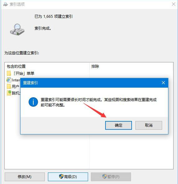 4、在高级选项界面点击“疑难解答”下面的【重建】按钮对索引功能进行重置,重置完成后点击 确定- 确定保存设置后重启计算机即可正常进行搜索。