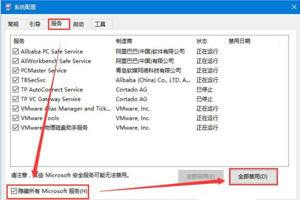 3、切换到【服务】选卡,在下面勾选【隐藏所有Microsoft 服务】,然后点击【全部禁用】按钮,最后点击【确定】保存设置。