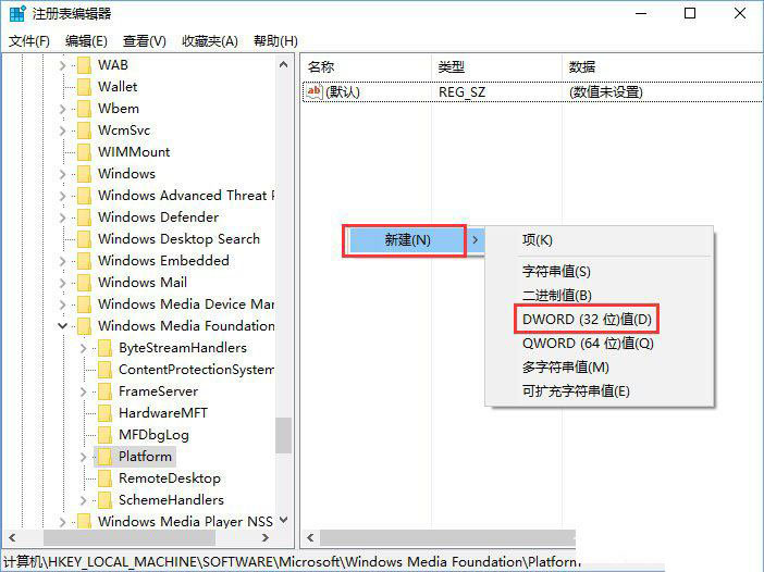 2、在注册表中依次展开:HKEY_LOCAL_MACHINE\SOFTWARE\Microsoft\Windows Media Foundation\Platform,在右边空白处点击右键,新建DWORD(32位)值,命名为 EnableFrameServerMode,点击确定即可。