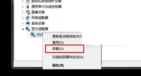 4.在打开的设备管理器窗口中,找到显示适配器然后卸载显示适配器中的显卡驱动。如下图所示