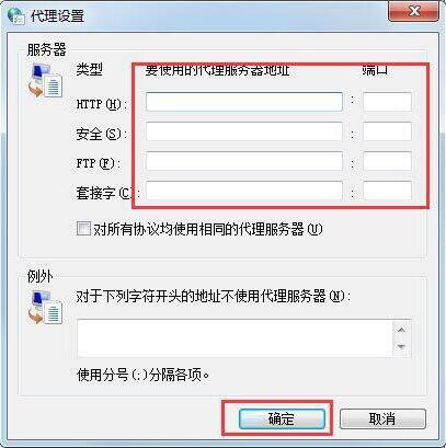 4.在弹出的“代理服务器设置”对话框下,设置不同类型的代理服务器(如 HTTP、HTTPS 或 FTP)。然后输入“要使用的代理服务器地址”,点击“确定”按钮即可。如图所示: