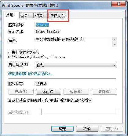 4、在依赖关系栏里,找到【print spooler】服务所依赖的相关服务rpc。如图所示: