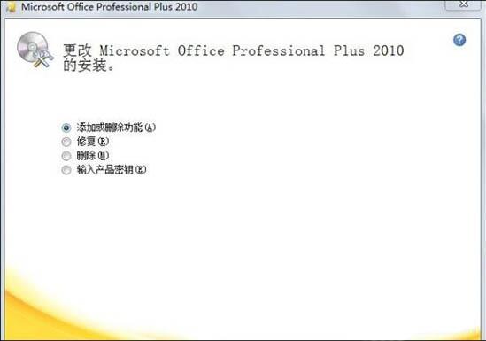 3、系统自动进入office2010安装程序,在菜单中选择第一行《添加或删除功能》。开始动手了;如图所示:
