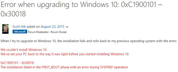 win7/win8.1用户升级win10不顺利并不是一件新鲜事,从7月29日Windows10正式版发布至今,已经有各种问题显现出来。其中有一个项就是错误代码为0xC1900101 - 0x30018的升级失败问题。微软目前已经证实该消息,并在微软社区发布消息称该问题正在修复中。
