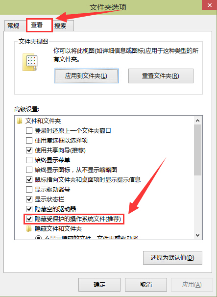 2.在弹出的文件夹选项窗口中,点击切换到“查看”项界面,然后找到“隐藏受保护的操作系统文件(推荐)”如下图所示