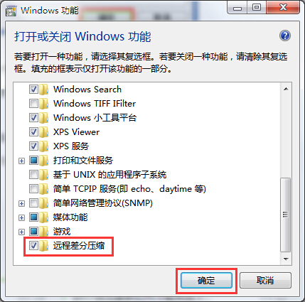 3.完成以上设置之后关闭所有窗口,然后在开始菜单搜索栏中输入“打开或关闭 Windows功能”点击打开打开或关闭Windows功能,在弹出的窗口中拖动滚动条找到“远程差分压缩”并且点击勾选,最后点击确定关闭窗口即可。如下图所示