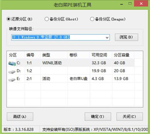 2、进入老白菜pe界面后,会自动弹出“老白菜PE装机工具”,若是没有弹出或不小心关闭则点击左侧“老白菜pe装机工具”图标。接下来在老白菜pe装机工具中,系统会自动识别相关的系统安装包,我们在下拉菜单中选择ghost win8系统安装包,接着选择系统盘,点击“确定”,如图所示: