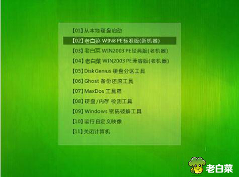 1、将u盘启动盘插入usb接口,重启电脑进入老白菜菜单界面,然后按方向键“↓”选择“【02】老白菜 WIN8 PE标准版(新机器)”,回车键进入,如图所示: