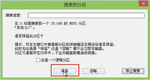 5.在弹出的搜索到分区窗口中,点击“保留”继续搜索其他丢失的分区。如下图所示