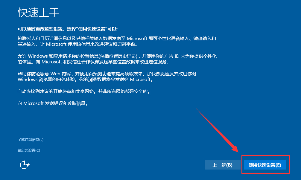 12.在快速上手界面中,点击“使用快速设置(E)”进入用户帐户创建窗口。如下图所示