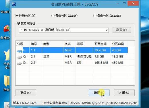 2、进入老白菜pe界面后,会自动弹出“老白菜PE装机工具”,若是没有弹出或不小心关闭则点击左侧“老白菜pe装机工具”图标。接下来在老白菜pe装机工具中,系统会自动识别相关的系统安装包,我们在下拉菜单中选择win11系统安装包,接着选择系统盘,点击“确定”,如图所示: