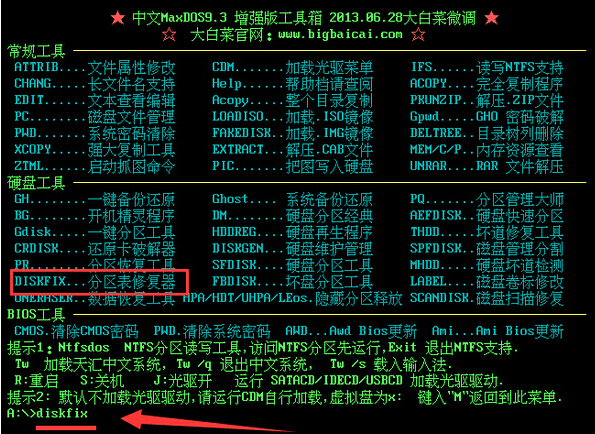4.在MAXDOS工具选择界面,输入“diskfix”回车确认,打开分区表修复器。如下图所示