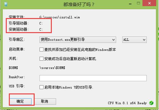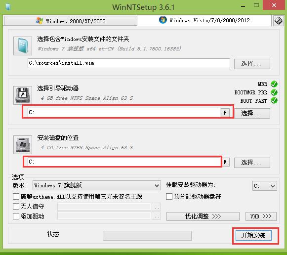 6、接着引导驱动器和安装磁盘的位置都选择为c盘,点击“开始安装”,如下图所示: