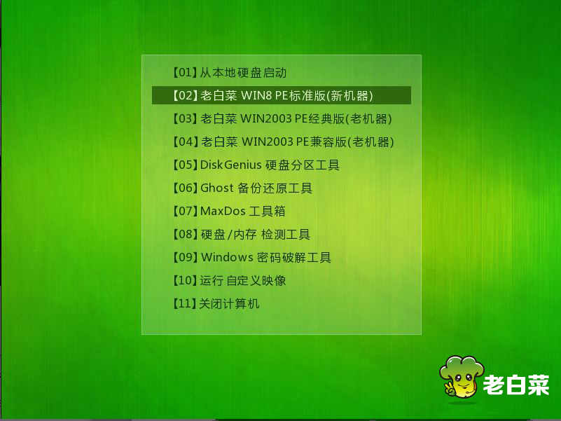 1、首先将u盘制作成老白菜u盘启动盘,接着前往相关网站下载win7系统存到u盘启动盘,重启电脑等待出现开机画面按下启动快捷键,选择u盘启动进入到老白菜主菜单,选取“【02】老白菜win8 pe标准版(新机器)”选项,按下回车键确认,如下图所示: