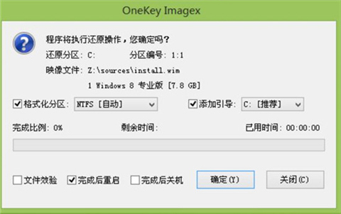 4、等系统释放完成后,会出现一个重启倒计时窗口,我们点击“确定”也可不管它,重启电脑后,等待系统设置完成我们就可以使用win8系统了,如图所示: