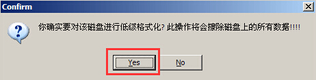 5.在弹出的提示窗口中,点击“Yes”开始对硬盘进行低级格式化。如下图所示